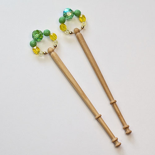 These lovely midland bobbins are made of a light wood (Guatambu/Brazilian Maple) and have been polished to a smooth, glossy, look and feel. The bobbins are spangled with lovely glass beads to give them the proper weight. We’ve created these bobbins for when you’re looking for something particular to add to your collection.